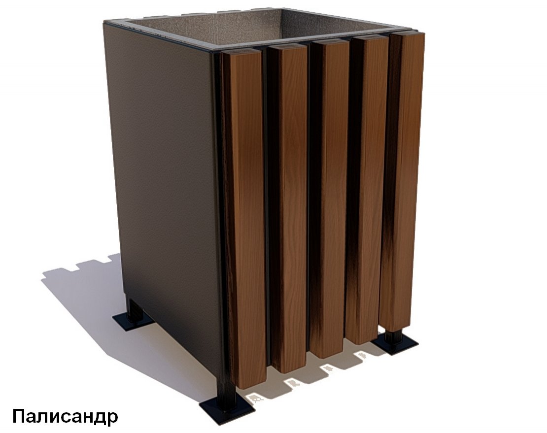 Мусорная урна прямоугольного сечения имеет стальной корпус с декоративными деревянными панелями, маскирующими утилитарное назначение изделия в парках и других зелёных зонах, а также на оживлённых городских улицах.